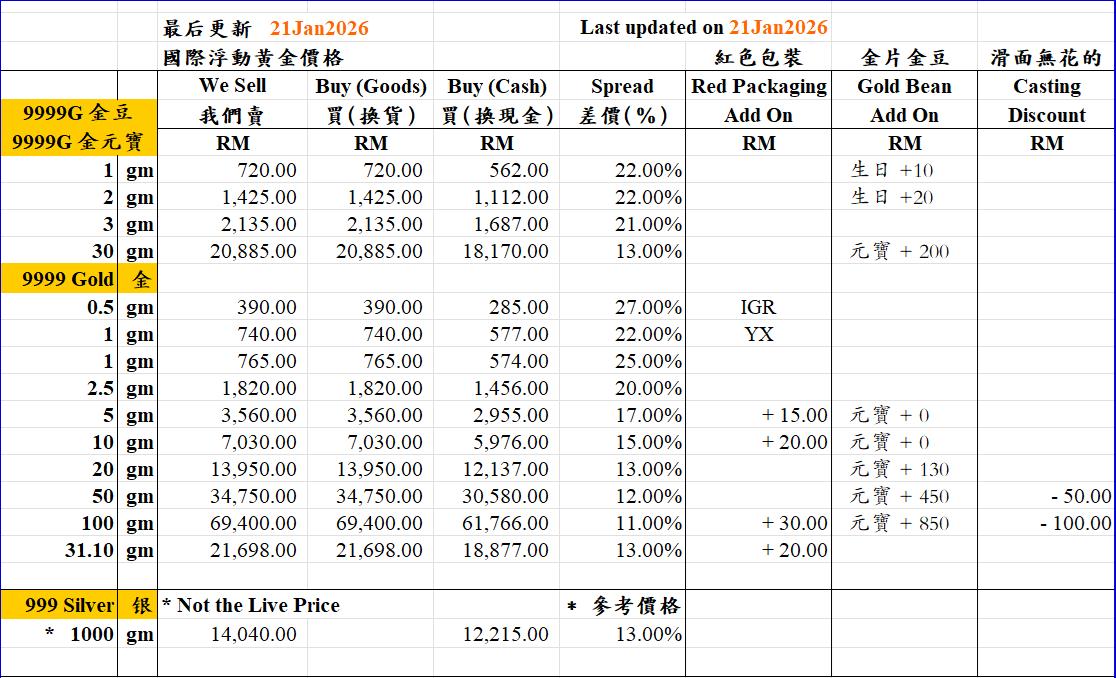 Retail Gold Jewellery Price from 21 Jan 2026 until now.