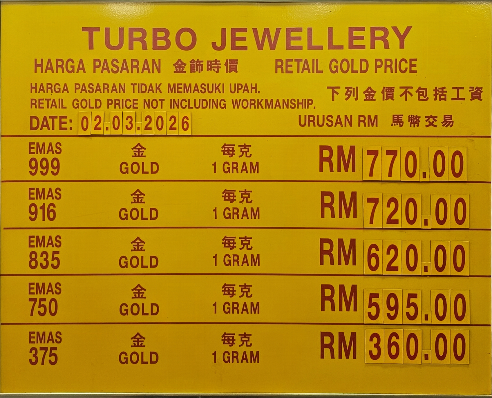 Retail Gold Jewellery Price from 02 Mar 2026 until now.