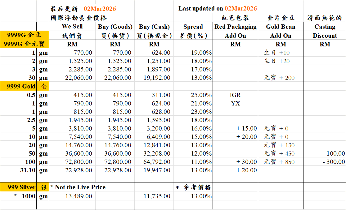 Retail Gold Bar Price from 02 Mar 2026 until now.