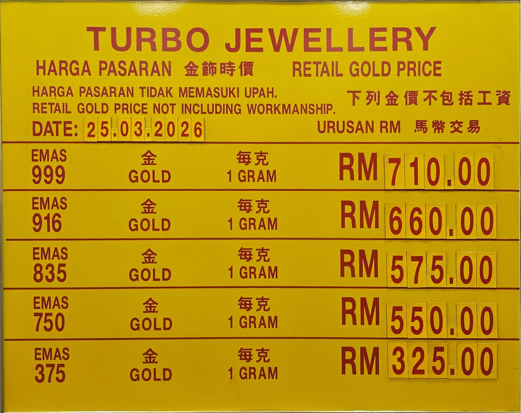 2026 年 03 月 25 日至今的黄金首饰零售价格。